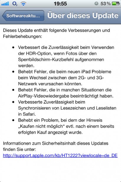 Apple hat seit langer Zeit mal wieder ein Update für das iOS Betriebssystem veröffentlicht. Mit dem gestrigen iOS Update auf Version 5.1.1  wurden einige Sicherheitslücken geschlossen, aber auch andere Probleme behoben. Neben drei kritischen Sicherheitslücken im Safari Browser und WebKit dürften sich gerade die iPad User über das Update freuen, das spezielle Probleme beim Wechsel zwischen 2G und 3G Netzen, sowie Probleme bei der Airplay Wiedergabe löst. Weiter wurde die Zuverlässigkeit bei der Synchronisation von Lesezeichen verbessert und ein Problem beim Einkauf im Appstore behoben.