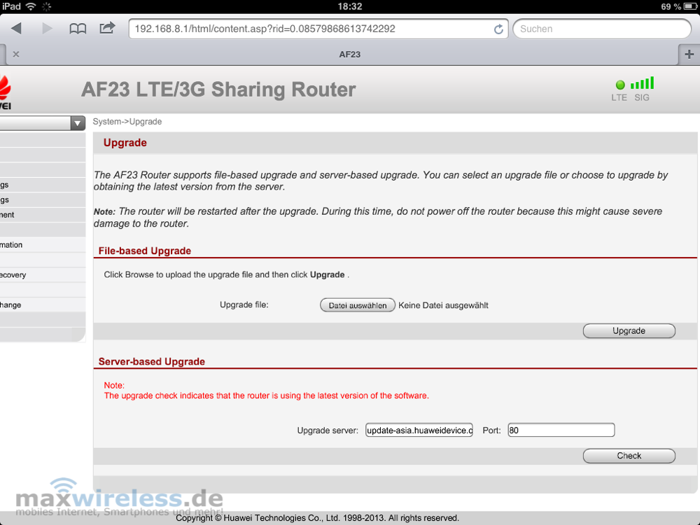 Alles in Allem ist der Huawei AF23 ein guter Router. Das Gerät tut genau das was es soll: die Internetverbindung eines USB-Surfsticks schnell und unkompliziert mehreren Geräten zur Verfügung stellen. Kompatibilitätsprobleme gibt es dabei keine: alle seit Mitte 2009 hergestellten Huawei-Surfsticks werden unterstützt, zukünftige Modelle können einfach per Firmware-Update hinzugefügt werden. Für Nutzer, die gerne umfangreiche Einstellungen vornehmen möchten, ist der AF23 Router aber nicht so gut geeignet, denn das Webinterface ist recht einfach gehalten und lässt viele Funktionen aus, die zum Beispiel für einen ähnlich teuren Dovado Tiny selbstverständlich sind.